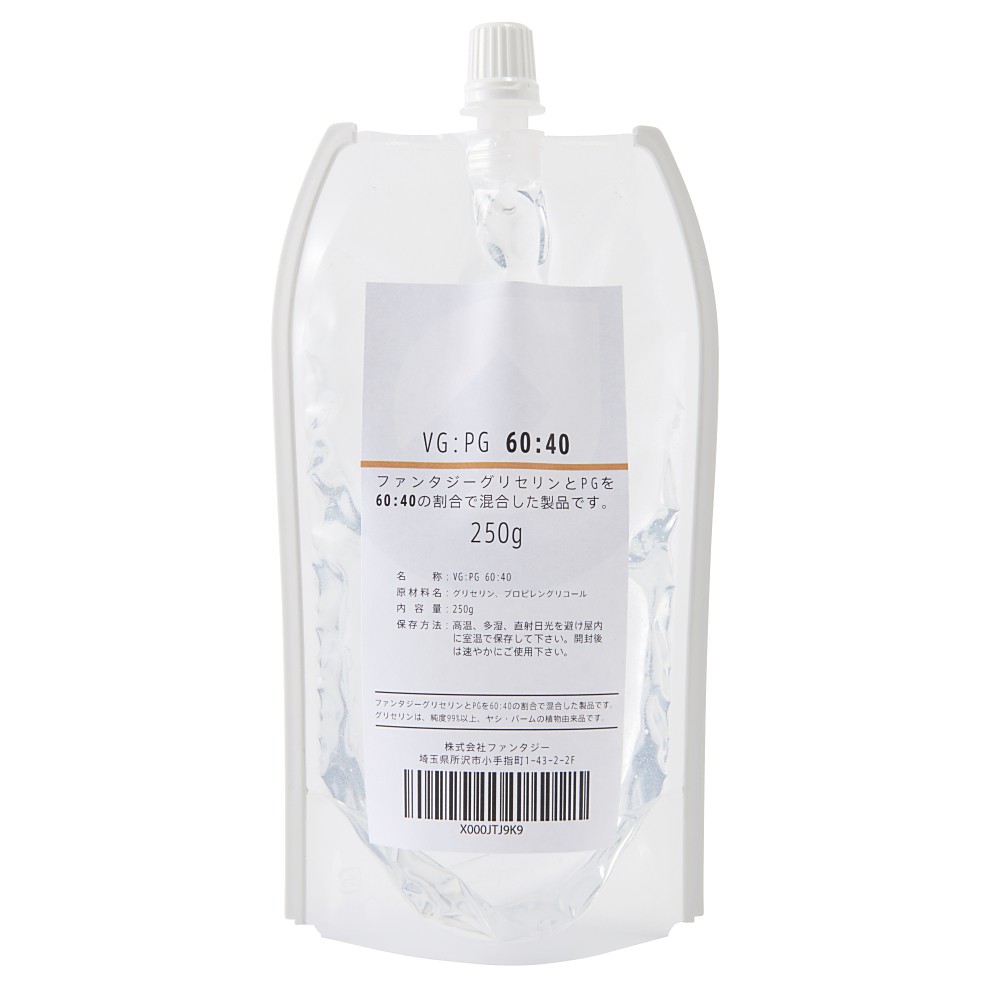 ファンタジーグリセリン(VG)とプロピレングリコール(PG)を60:40でミックスした製品です。容量は、250gです。