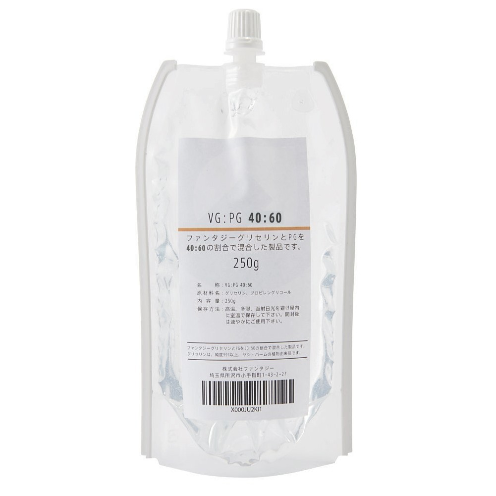 ファンタジーグリセリン(VG)とプロピレングリコール(PG)を40:60でミックスした製品です。容量は、250gです。