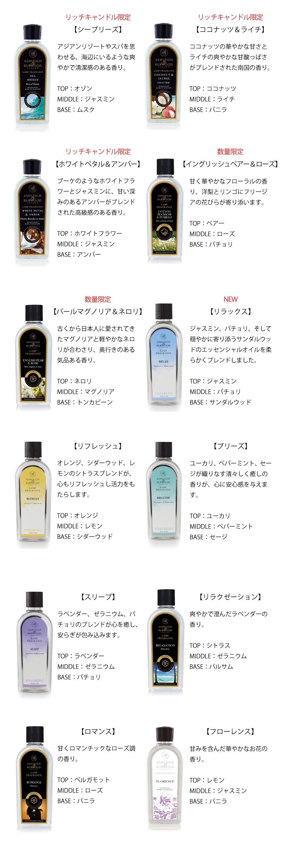 【Ashleigh & Burwood(アシュレイ&バーウッド)について】 〜ロンドン発の大人気ルームフレグランス〜 1993年にアロマの本場イギリス・ロンドンで誕生した『Ashleigh & Burwood(アシュレイ&バーウッド)』。 ロンドンの南郊外に位置するハイクオリティライフの象徴のような2つのエリアの名前を使用。 優雅な貴族の歴史を感じさせる土地は、まさに憧れです。エリア全体が『アロマ』といえる、癒しの環境で、ルームフレグランスが生まれました。 〜本場のセラピストがブレンドした本物の香り〜 それぞれのテーマが1つ1つブレンドした香りで、フレグランス・エッセンシャルオイルには、厳選した植物由来のものだけを使用しています。その為、心地良い香りがしっかりお部屋に広がります。 |