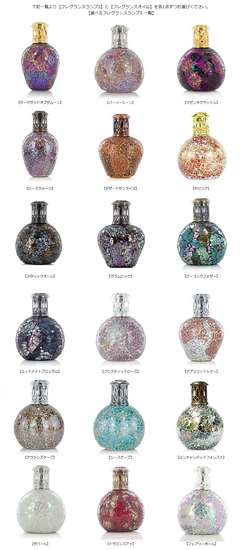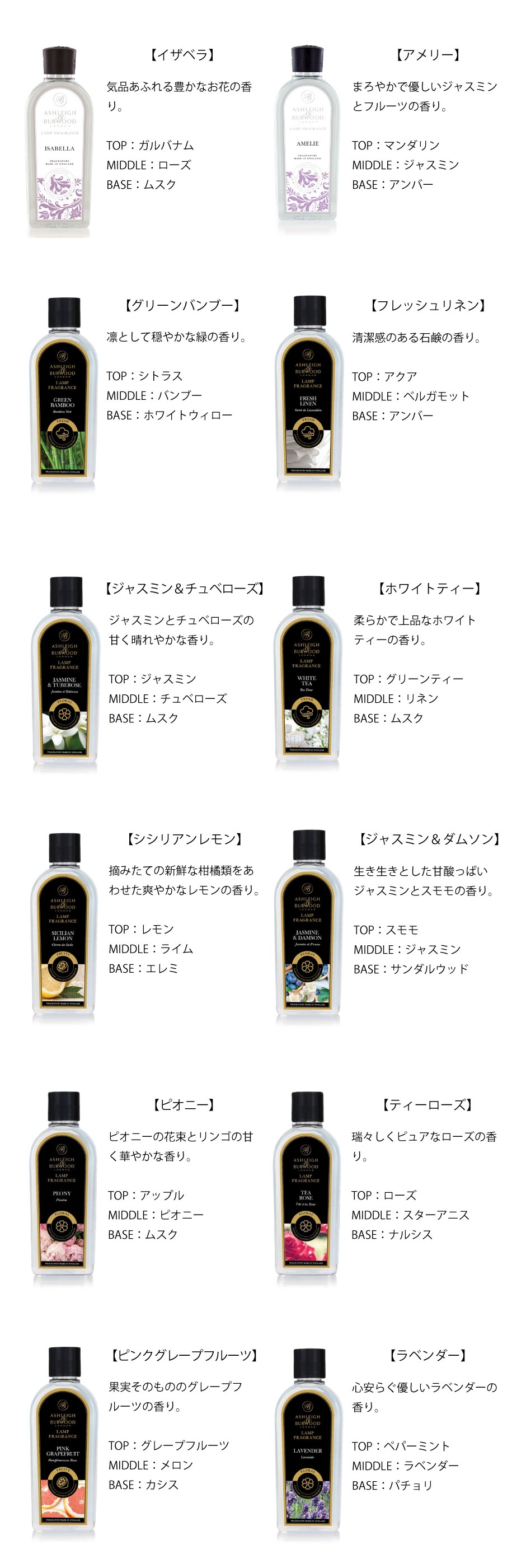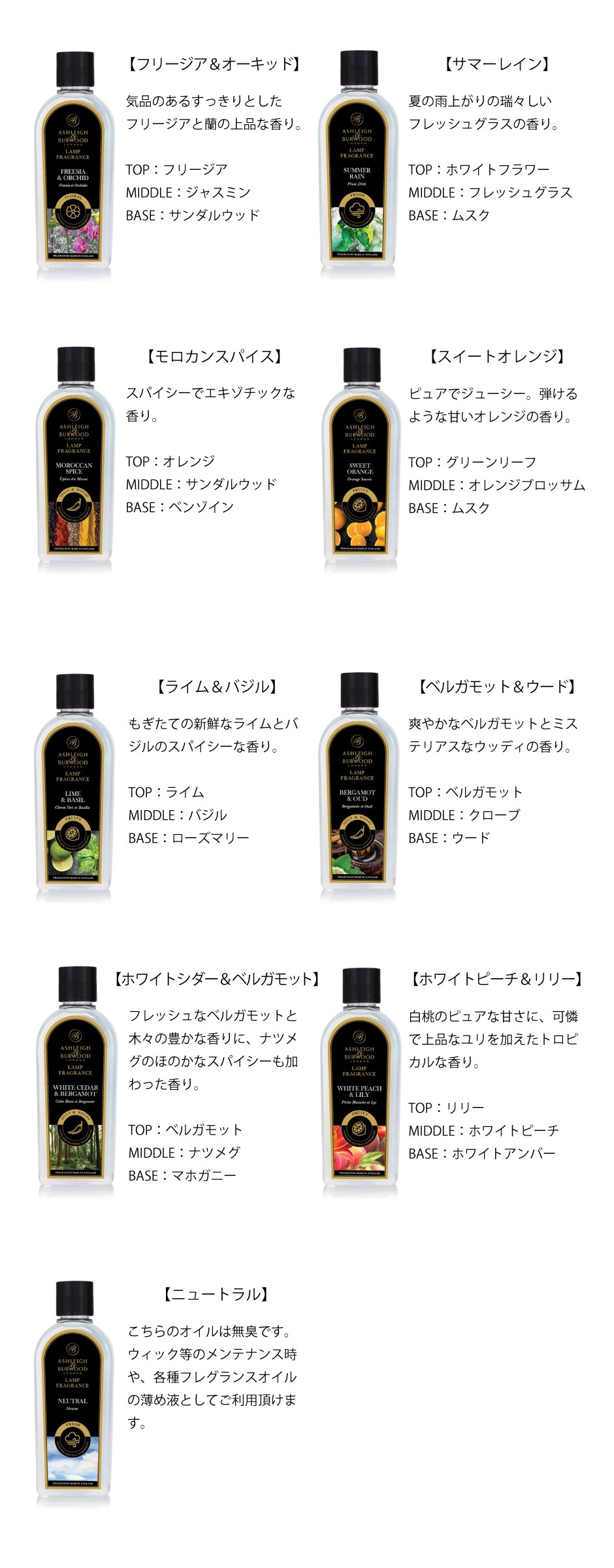 【正規品 フレグランスランプSとフレグランスオイルの選べるセット】 大人気アシュレイ&バーウッドのフレグランスランプSと専用フレグランスオイルがセットになりました!ギフトラッピングにも対応しておりますので、大切な方への贈り物やギフトにも是非ご利用くださいませ♪ アシュレイ&バーウッドのフレグランスランプは、美しくエレガントなデザインが魅力的で、一瞬にしてワンランク上の住環境を作り上げます。専用のフレグランスオイルも種類が豊富なので、あなたにぴったりの香りがきっと見つかります。 専用フレグランスオイルはお好きな香りをブレンドして、自分だけの特別な香りをつくり、お楽しみ頂く事が可能です。また、フレグランスランプはただ香りを楽しむだけでなく空気中の嫌な臭いを消臭し、あなたを心地よい空間へと導きます。 【セット内容】※各1点ずつ ■フレグランスランプS(専用ウィックS 1点付属) ■専用フレグランスオイル500ml ■オフィシャルショッパー(メーカー公式の紙袋) ■各種オフィシャルリーフレット 【Assured Bio Labs ※1 ※2 及び株式会社食環境衛生研究所※3 による実証データ】 ●≪30分使用後≫タバコの臭い99.9%消臭※1 ●≪180分使用後≫食べ物の臭い68%消臭※2 ●≪180分使用後≫アンモニア臭72%消臭※3 ※実生活空間(有人、居室等)での効果は環境により異なります ※常時発生し続けるニオイ成分、タバコ臭、煙微粒子はすべて除去できるわけではありません 【各製品概要】 ≪フレグランスランプS≫ ■製造国:イギリス ■各種サイズ ・丸形:H115×80mm ・リンゴ型:H115×80mm ・縦型:H130×65mm ≪フレグランスオイル≫ ■製造国:イギリス ■内容量:500ml ■芳香持続期間:約20時間※使用環境により異なります ※オイルの種類によっては色味がついている事がございますが、劣化等ではなく品質に全く問題ございません ※ランプは職人によるハンドメイドの為1つ1つに個体差があり、画像とイメージが異なる場合がございます ※予告なくフレグランスオイルのパッケージやキャップの仕様が変更となる場合がございます |