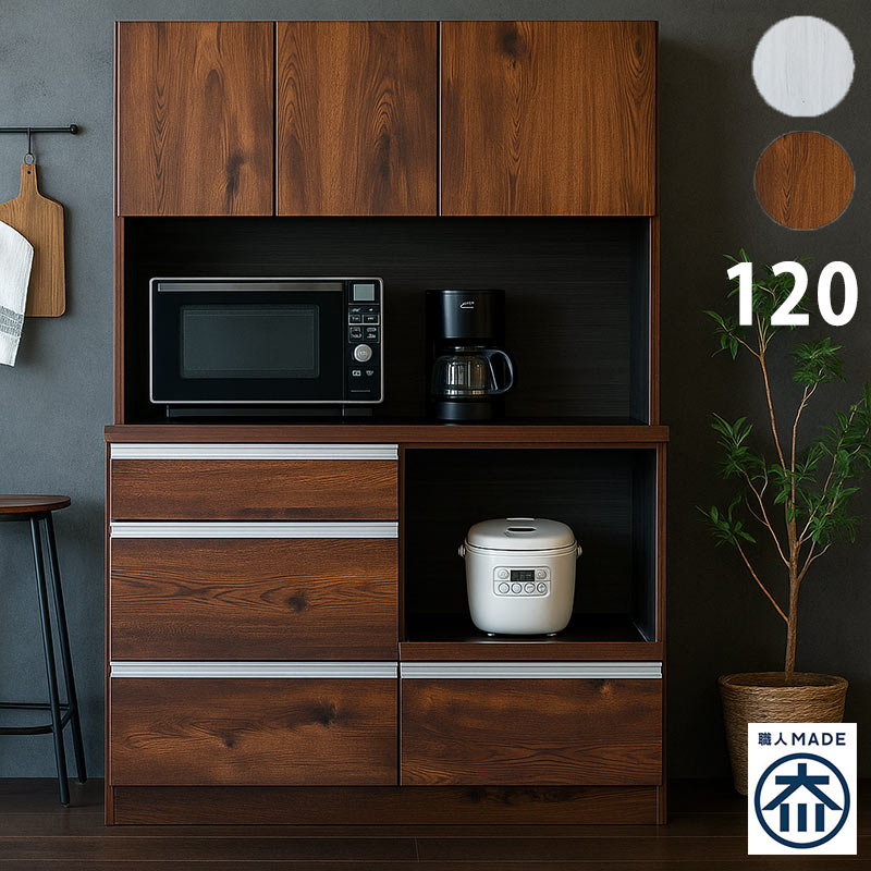 国産 食器棚 幅120cm レンジ台 大川家具 キッチンボード ダイニング収納 おしゃれ 引き出し付き