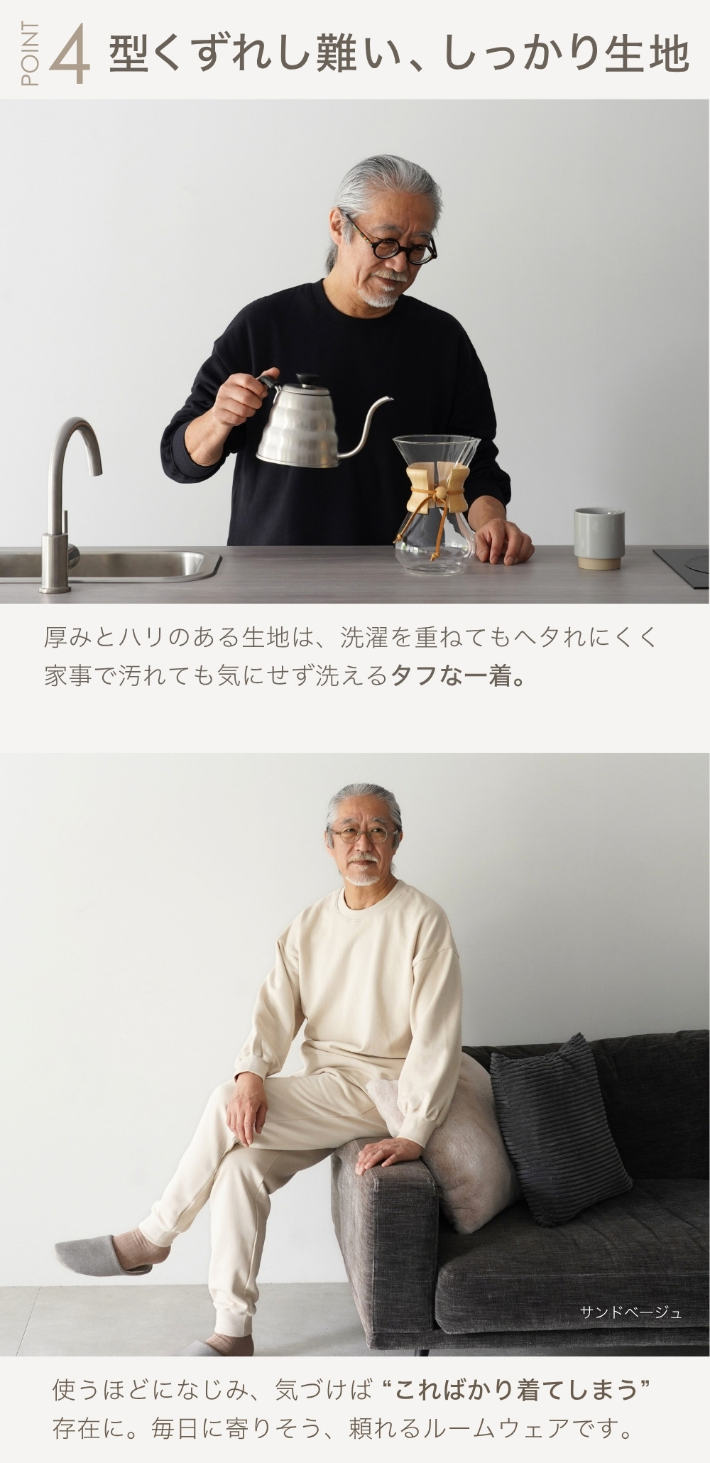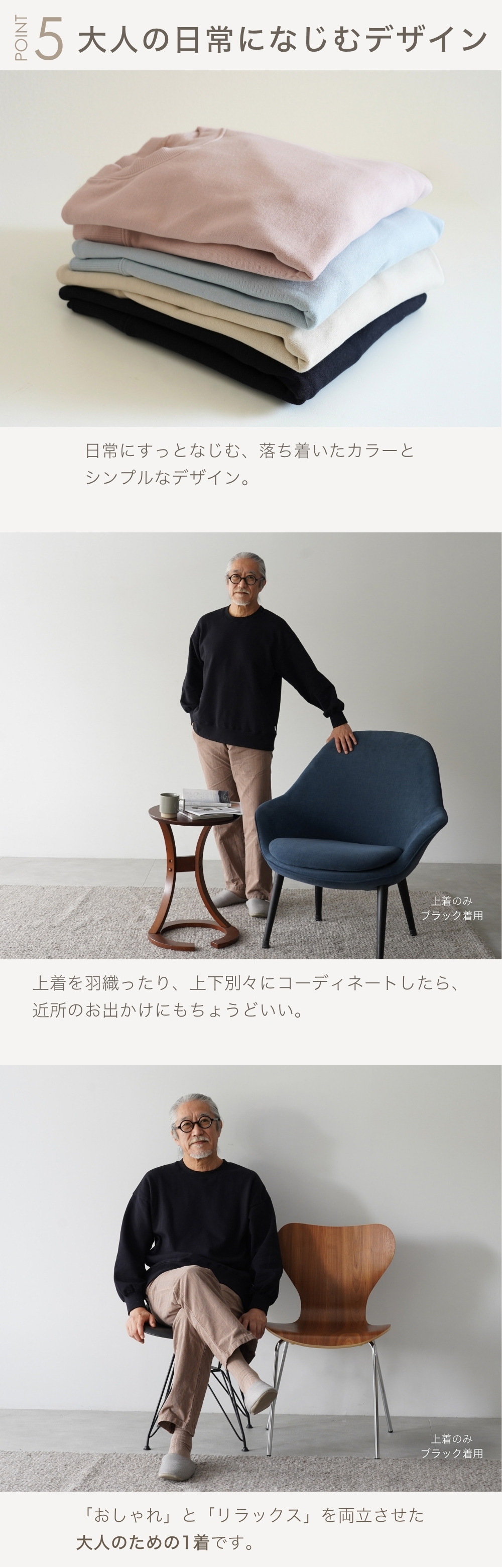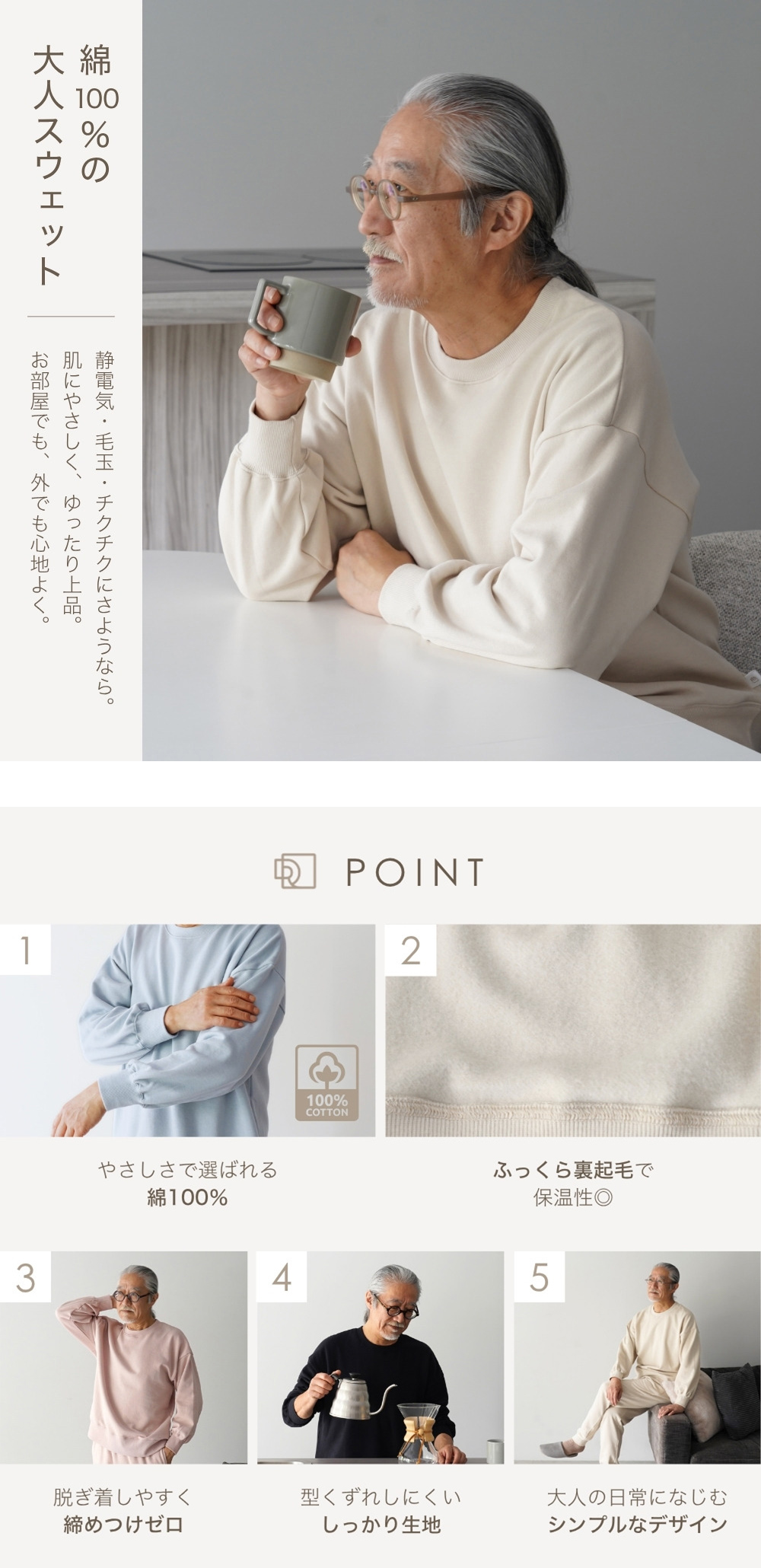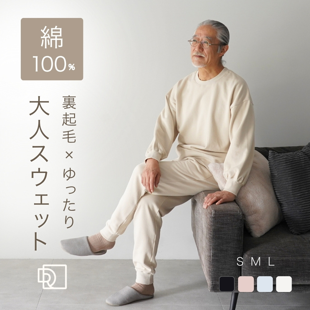 | 商品詳細 | 肌に暮らしに、ちょうどいい。 【Point1】やさしさで選ばれる綿100%スウェット 「綿100%」ならではのしなやかな肌ざわりで、着た瞬間からほっとする気持ちよさ。化学繊維のチクチク感が気になる方、ご年配の方も安心して使える天然素材です。毛玉や静電気も起きにくく、長くきれいに使えるのも嬉しいポイント。 【Point2】ふっくら裏起毛で保温性◎ スウェット裏面は、空気をたっぷり含むふんわり裏起毛で保温性も抜群。着た瞬間からぬくもりに包まれて、寒い朝も夜も快適に過ごせます。 【Point3】脱ぎ着しやすく、締めつけゼロ。 大人の体に寄り添う、ゆったりとしたサイズ感が魅力のスウェットです。肩やお腹まわりに十分なゆとりがあるから締めつけ感が少なく、部屋着としてもパジャマとしてもストレスフリー。長めの裾丈でお尻まわりもカバー。ラフすぎず、でも気取らない、絶妙なシルエットです。 【Point4】型くずれしにくい、しっかり生地 厚みとハリのあるスエット生地は、洗濯を重ねてもヘタれにくく、家事で汚れても気にせず洗えるタフな一着。「着れば着るほど、好きになる」毎日に寄り添う頼れるルームウェアです。 【Point5】大人の日常になじむシンプルなデザイン 日常にすっとなじむ、落ち着いたカラーとシンプルなデザイン。シャツを重ねたり上着を羽織れば、在宅ワークにも、近所のお出かけにもちょうどいい。「おしゃれ」と「リラックス」を両立させた大人のためのスウェット上下セットです。 |