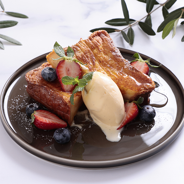 厚切りトーストにアパレイユ(卵、牛乳、砂糖、バニラシーズペーストを合わせた卵液)をしみ込ませたふわふわフレンチトーストと、濃厚な味わいのバニラアイスのセット。