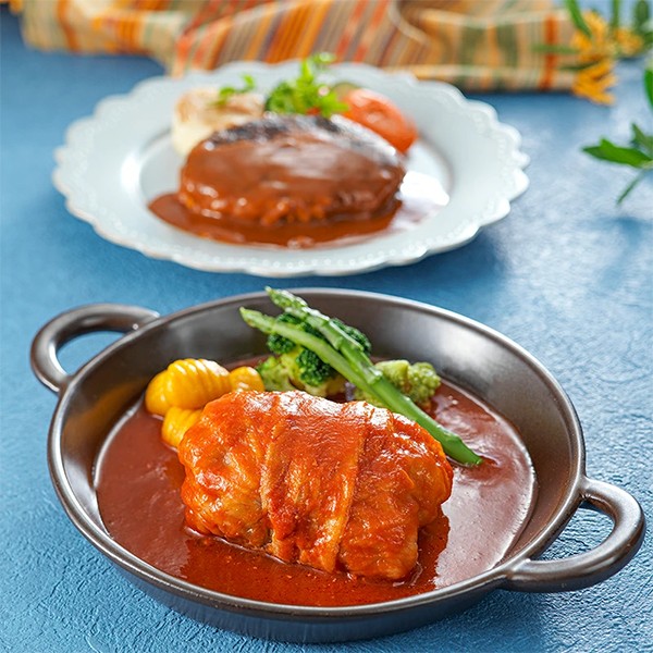 肉の旨みと舌触りにこだわりトマトソースで煮込んだロールキャベツと、旨味とコクのバランスの整ったデミグラスソースと肉汁があふれ柔らかい仕上がりの手ごねハンバーグのセット。