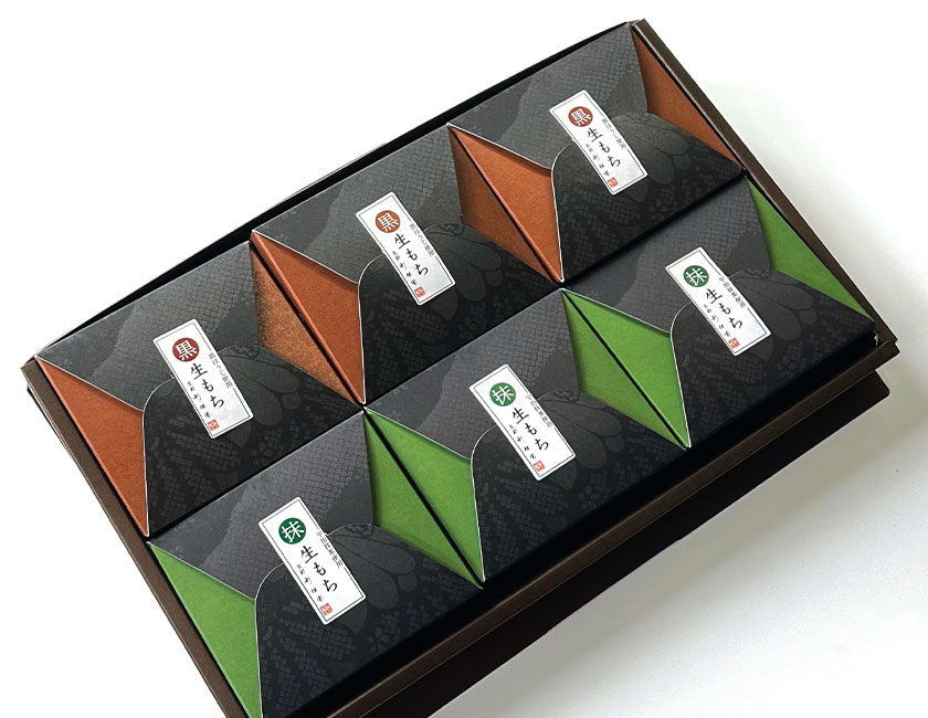 画像は「生もち宇治抹茶」と「生もち黒ほうじ」のセットのパッケージ