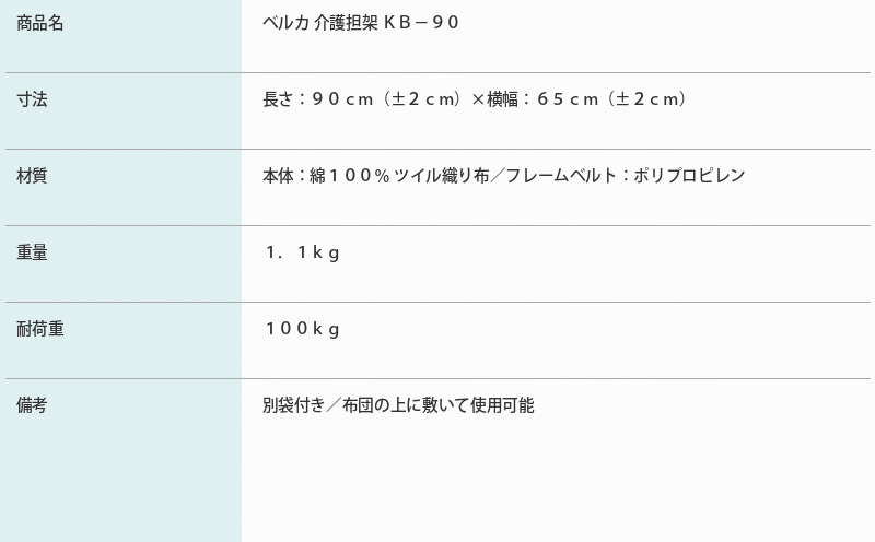 布地をしっかりとベルトでささえてあるので持ちやすく、患者さんを包み込む形なので落としてしまうことなく、素人でもスムーズに運ぶことが出来ます。また、持ち上げたときも肩と腕で担ぐので軽く感じます。一般家庭での運用でも非常に扱いやすい担架です。
