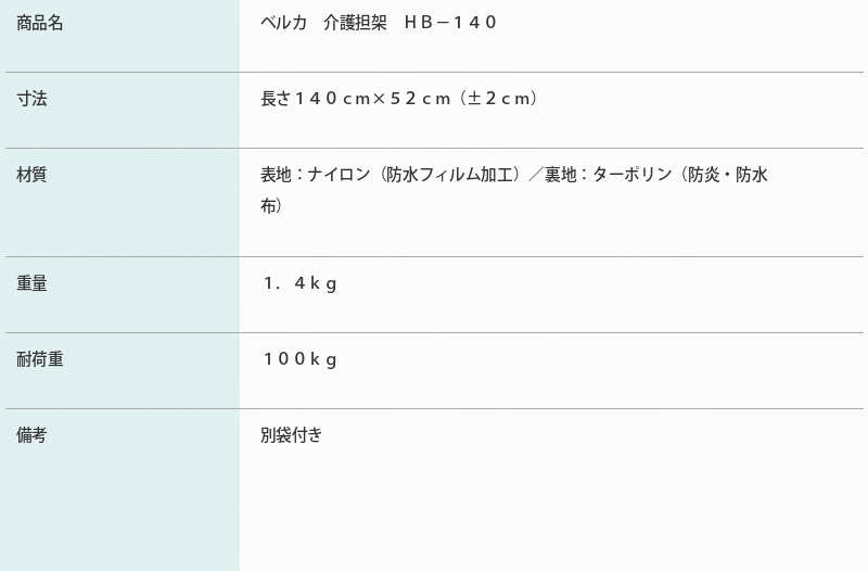 担架生地を綿100%で作った標準的なベルカです。ツイル織り(あや織り)の二重縫製の生地を使用しているので丈夫で、切れにくく安心感の高い担架です。防水、防炎性能はありません。