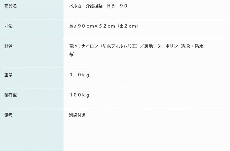 担架生地を綿100%で作った標準的なベルカです。ツイル織り(あや織り)の二重縫製の生地を使用しているので丈夫で、切れにくく安心感の高い担架です。防水、防炎性能はありません。