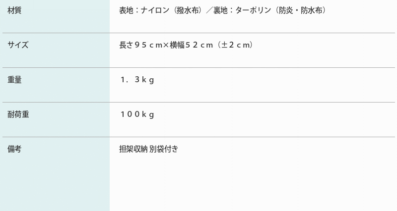 担架生地を綿100%で作った標準的なベルカです。ツイル織り(あや織り)の二重縫製の生地を使用しているので丈夫で、切れにくく安心感の高い担架です。防水、防炎性能はありません。