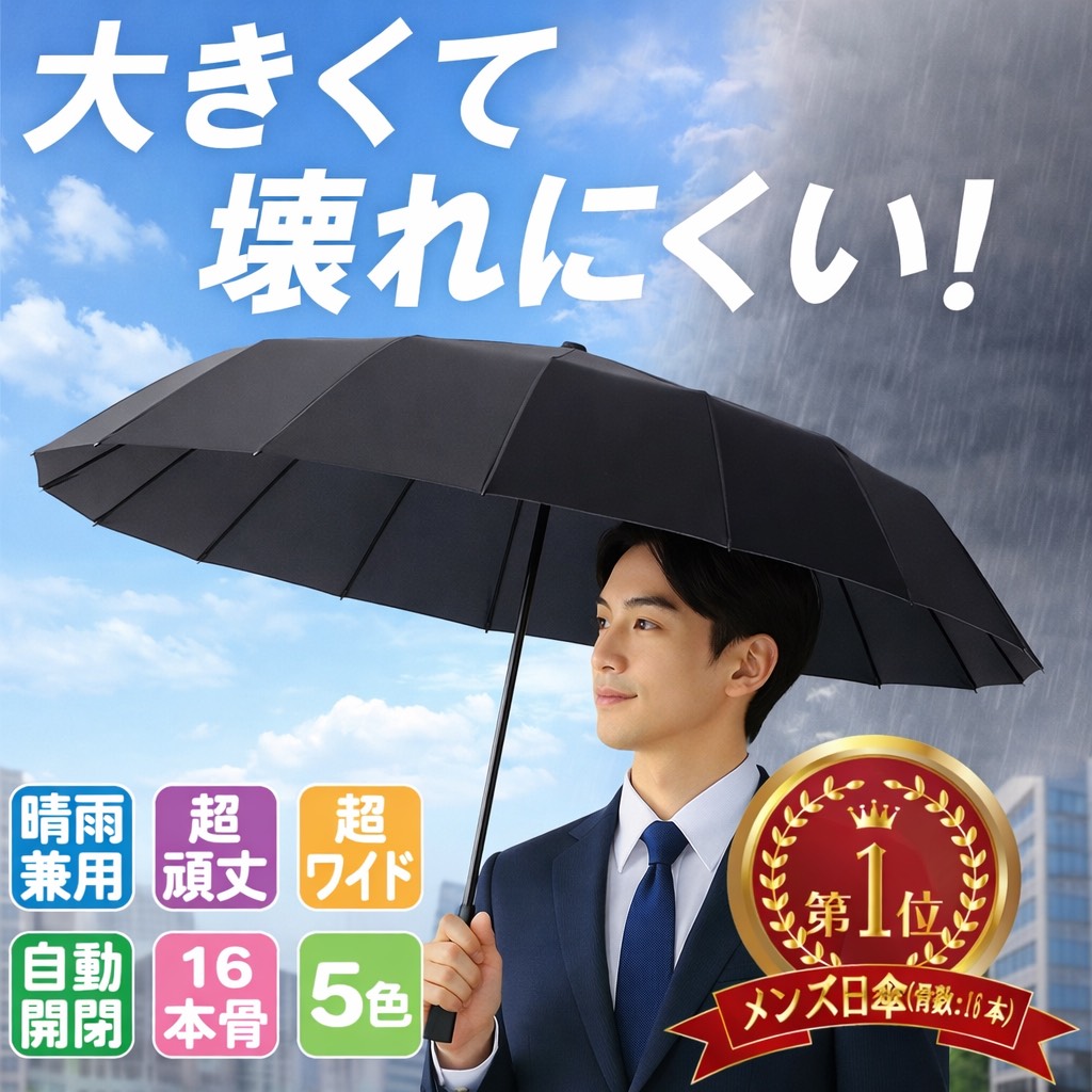 晴雨兼用・自動開閉・超頑丈・耐強風・16本骨のワイドサイズのメンズ日傘が登場!