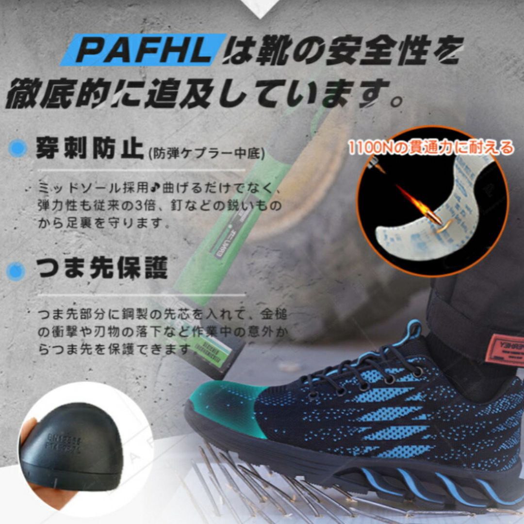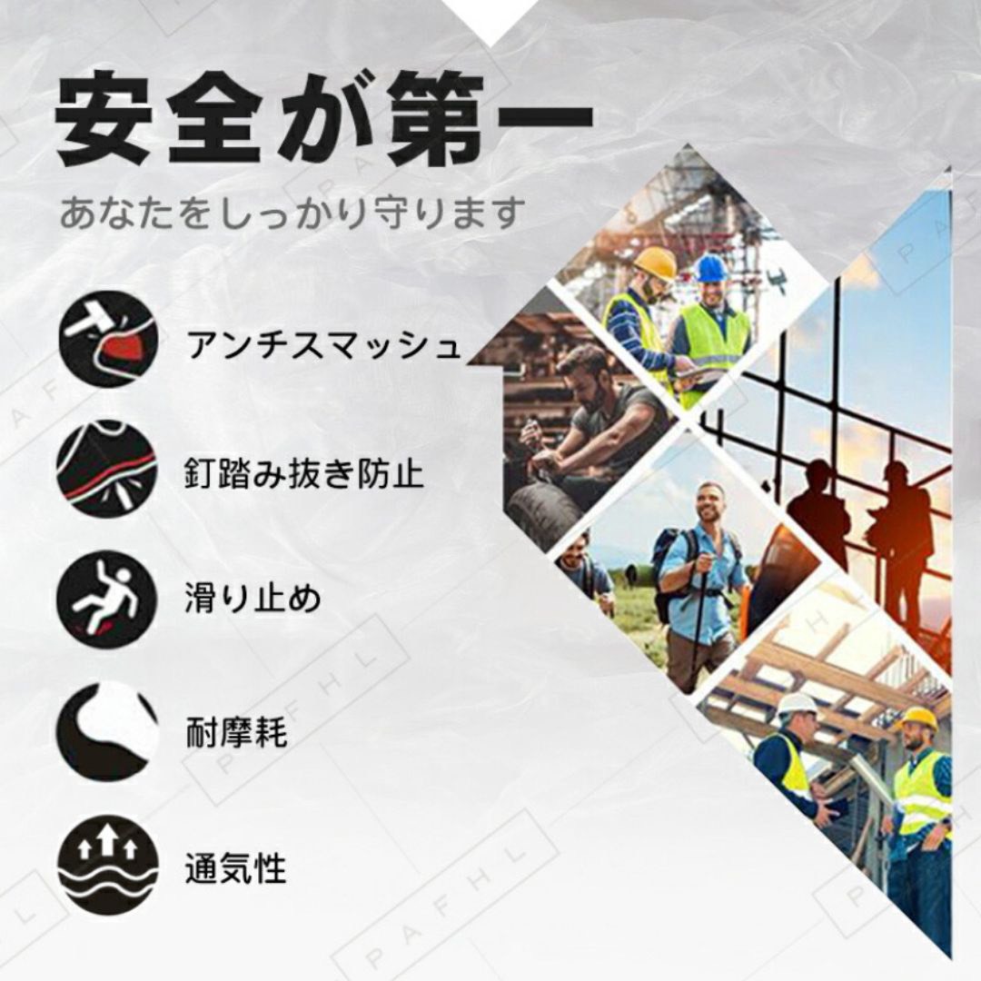 ◎釘踏み抜き防止:ミッドソールはケブラー防弾繊維を特別に採用するこそ、驚きの1100Nに達するまでの圧迫力に耐えられ、釘などに踏んでも平気。