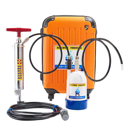 浄水装置一式がキャリーケース内に収納されていて、電源やガソリンを必要とせず、その場で手動により水を確保することが可能です。