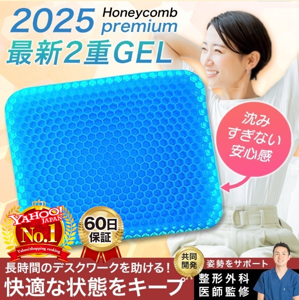 【整形外科医師 監修】医師が本気で薦めるゲルクッション!2重ハニカム構造!このクッションの一番の特徴は硬さ!長時間の座位が必要な際にお勧めできる製品です。少しかため!超極厚さ3.0cm!座っても卵が割れない大人気クッションがアップグレード!!驚異の衝撃吸収力で体圧を吸収・分散して負担を軽減。二重ハニカム構造の高弾性ゲルが、着座時の腰やお尻への負担を軽減。◆おしりを解放! お尻への圧力を360度分散させ、お尻のストレスを解消! 長いデスクワークや運転で座り疲れでお尻が痛くなってくる。 お尻への圧力を360度分散させるハニカム構造で座っても快適が長続きします。◆弾力ハニカム構造 弾力性が優れた素材を使用したハニカム構造クッション。耐久性も抜群!◆抜群の通気性 二重ハニカム構造のゲルは通気性の良い構造。◆滑り止め加工を施したカバー付き。 肌触りもよく簡単に取付け取外し・洗濯が可能。本体サイズ:約幅42cm×高さ3.0cm×奥行36cm材質本体:TPEカバー:ポリエステル滑り止め加工カバー付き。
