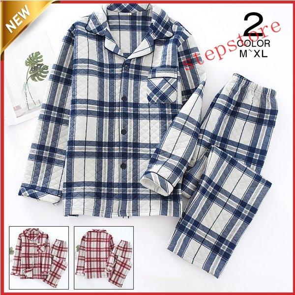 パジャマメンズレディースガーゼ長袖甚平前開きローグパンツ男女兼用上下セット中綿チェック柄部屋着着物秋冬2021