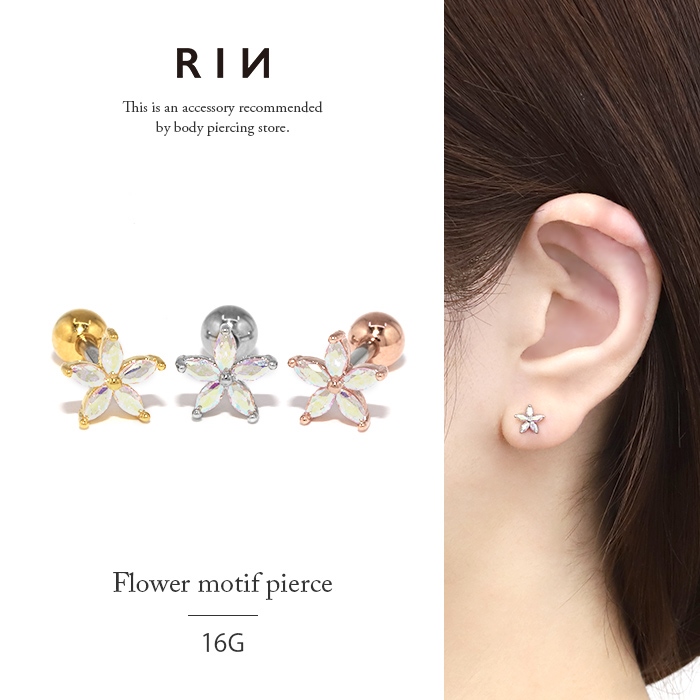 ボディピアス 軟骨ピアス 16G 花 フラワー ジュエル オーロラ サージカルステンレス セカンドピアス 片耳用