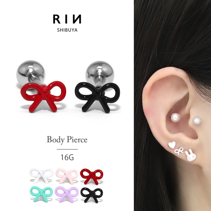 ボディピアス 16G リボン りぼん 可愛い おしゃれ 赤 黒 紫 緑 白 トラガス ヘリックス 耳たぶ 軟骨1458 d-052