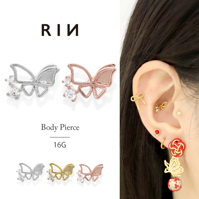 軟骨ピアス 16G ボディピアス 蝶々 蝶 バタフライ ジュエル ストレートバーベル サージカルステンレス 片耳用