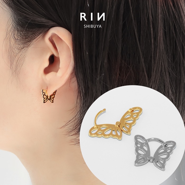 【両耳用・2個売り】 フープ ピアス 可愛い かわいい リング 蝶 昆虫 ちょうちょ 透かし模様 バタフライ 18金 コーティング 個性的 アクセサリーカテ0080 fp-064
