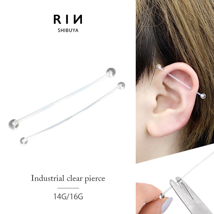 インダストリアル 透明ピアス 14G 16G 樹脂 ボディピアス 軟骨 金属アレルギー対応 ロングバーベル メンズ 長さ調節 片耳用