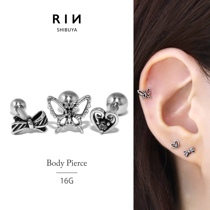 ボディピアス 軟骨 ピアス 小さめ ハート 蝶 蝶々 リボン アンティーク シルバー ストレートバーベル 可愛い 耳たぶ トラガス colsv 軟骨1401 h752-69