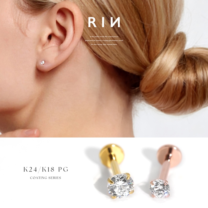 ボディピアス 24金 トラガス 16G 14G 18G 軟骨 ジュエル ラブレットスタッド 片耳用 金属アレルギー対応 つけっぱなし