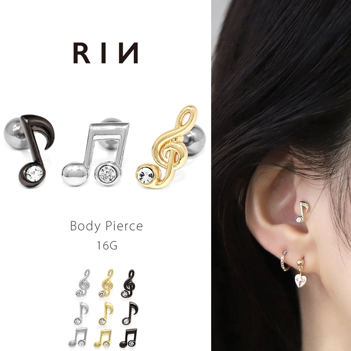 ボディピアス 軟骨ピアス 16G 音符 ト音記号 音楽 キラキラ 凛オリジナル 音楽 ジュエル 黒 片耳用 軟骨1556 rin-015
