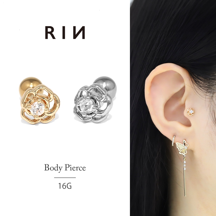 ボディピアス 花 軟骨ピアス 16G 薔薇 バラ フラワー かわいい 透かしデザイン ジュエル ストレートバーベル トラガス ヘリックス 片耳用 軟骨1549 rin-019