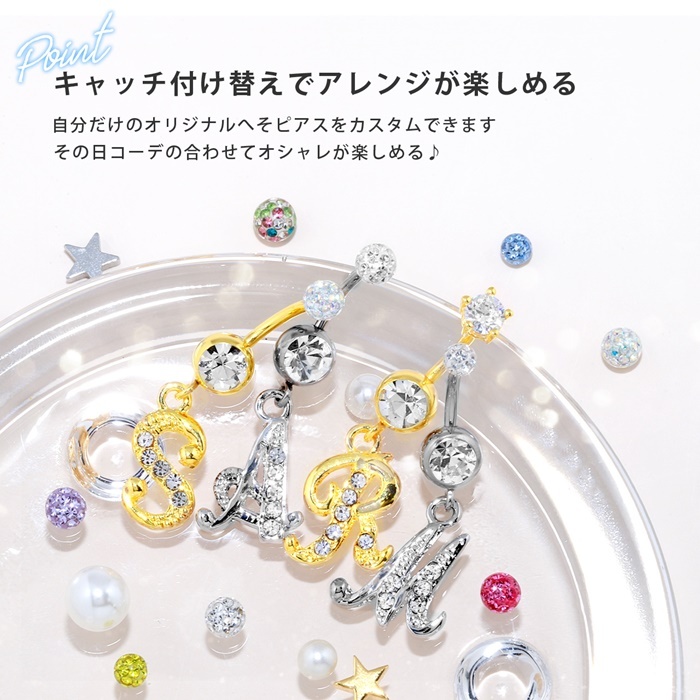 人気 ボディピアス へそピアス 14G 14ゲージ バナナバーベル サージカルステンレス ステンレス イニシャル アルファベット ジュエル シルバー ゴールド 金属アレルギー アレルギー シンプル キラキラ 夏 海 プール heso へそピ 臍 おしゃれ オシャレ かわいい 可愛い body Pierce レディース 通販