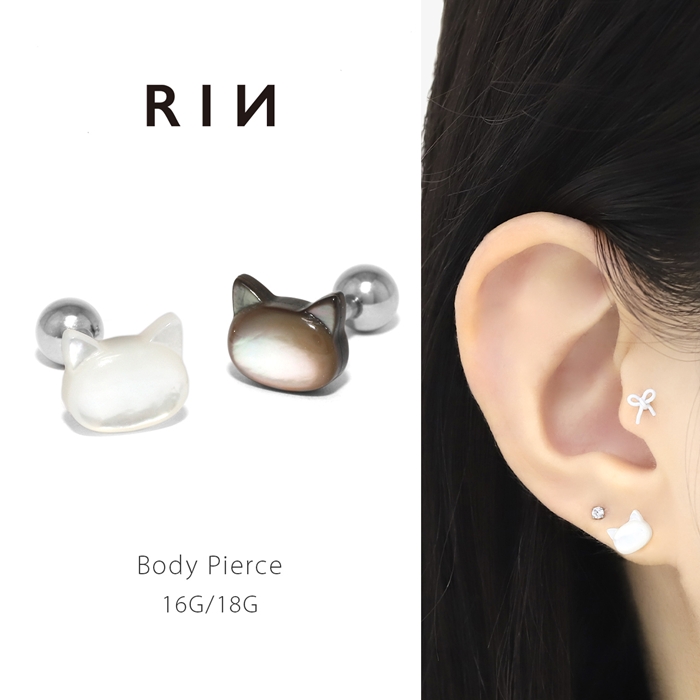 軟骨ピアス 16G 18G 猫 ネコ 金属アレルギー対応 つけっぱなし 天然シェル サージカルステンレス 片耳用