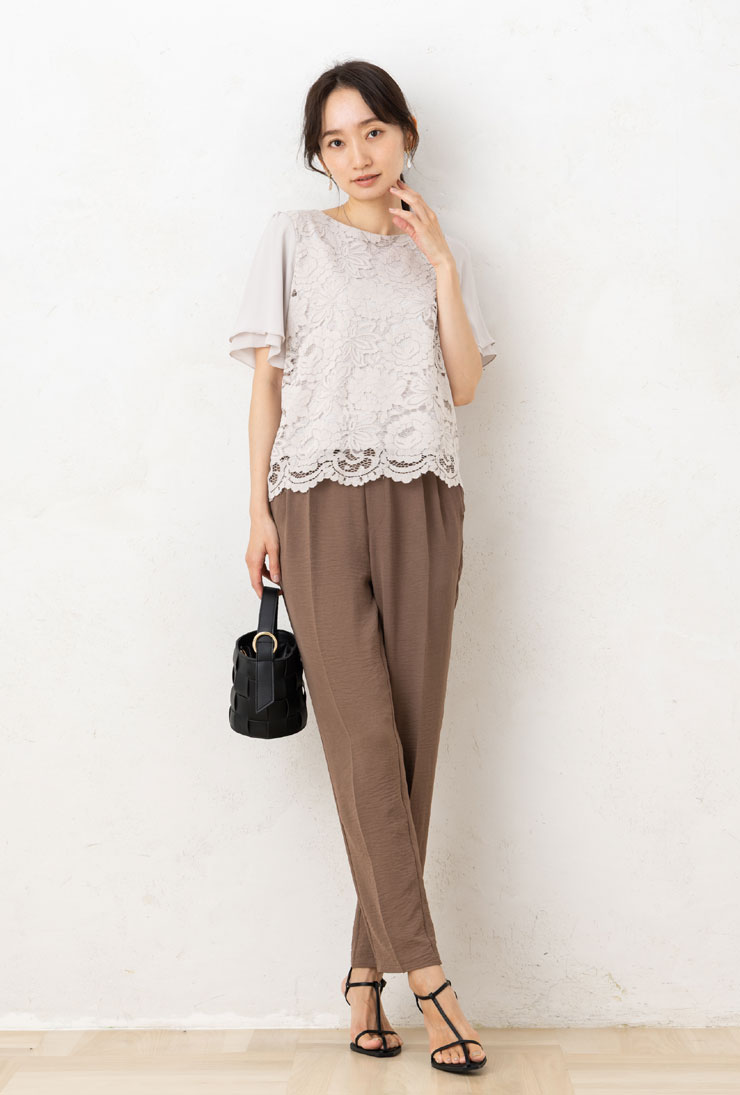 シボのあるジョーゼットに快適天竺カットソー素材を重ねたブラウスです。前身頃のレース遣いが、フェミニンな表情を演出。デイリーにはもちろん、お出かけや入学式・卒業式などのセレモニーにもおすすめです。