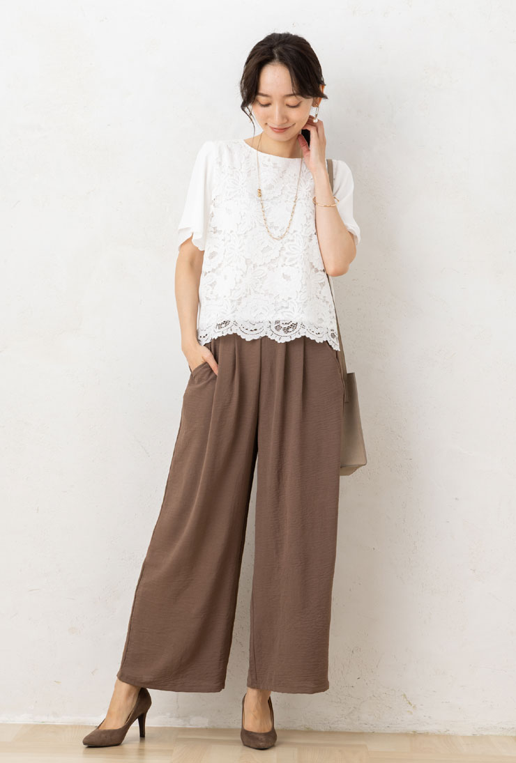 天竺カットソー素材を重ねた、快適なブラウスです。前身頃のレース遣いが、フェミニンな表情を演出。お出かけやセレモニーにもおすすめ。