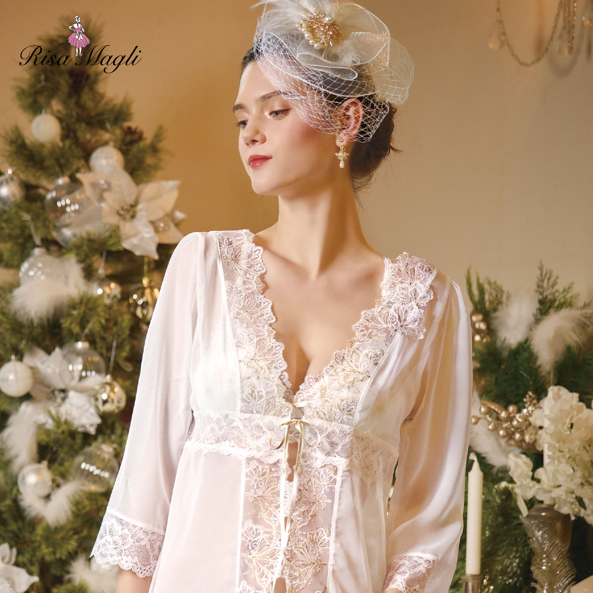 | 【輝きが奏でる特別なクリスマス】 パリの劇場の夜をイメージした、リサマリのクリスマスコレクションです。 クラシカルな建物や扇をモチーフにした装飾品などを表現したレースは、ラメ糸の輝きが組み合わさり、まるで優美なドレスをまとっているような豪華さに仕上がりました。 ネックラインには扇のシアーアップリケをアシンメトリーに重ねることで、レースの刺しゅうをほんのりと透かして立体的な印象をプラスしています。バスト下の切り替えレースやパフスリーブなど、クリスマスの特別な夜にぴったりな大人の気品あふれるアイテムに。 カラーはワントーンでまとめて輝きを引き立たせた、クリスマスらしいホワイト、レッド、ネイビーで展開しています。 日常のふとしたたたずまいも、美しいものへと変えてしまうようなアイテムになれますように。ワンランク上の美しさを演出した 「Risa Magli Reine(レーヌ)」ブランドの世界観をお楽しみください。 <サイズ> M:バスト 79〜87cm(着丈:約110cm) <商品仕様> ・身生地の伸縮性:なし ・素材:ナイロン・ポリエステル・ポリウレタン <関連アイテム> お揃いのアイテムは以下よりご確認ください。 ・69280 ブラジャー(B・C・D) ・69281 ブラジャー(E・F) ・69282 ブラジャー(G・H) ・59283 ソフトブラ ・79280 ノーマルショーツ ・79281 レースショーツ ・79284 スペシャルTバックショーツ ・79289 スペシャルレースショーツ ・19280 スリップ ・19283 ドレス ・09289 ガーターベルト ・39285 カーディガン |