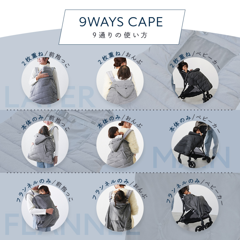 9WAY仕様で秋冬〜春先まで使える多機能ベビーケープ。