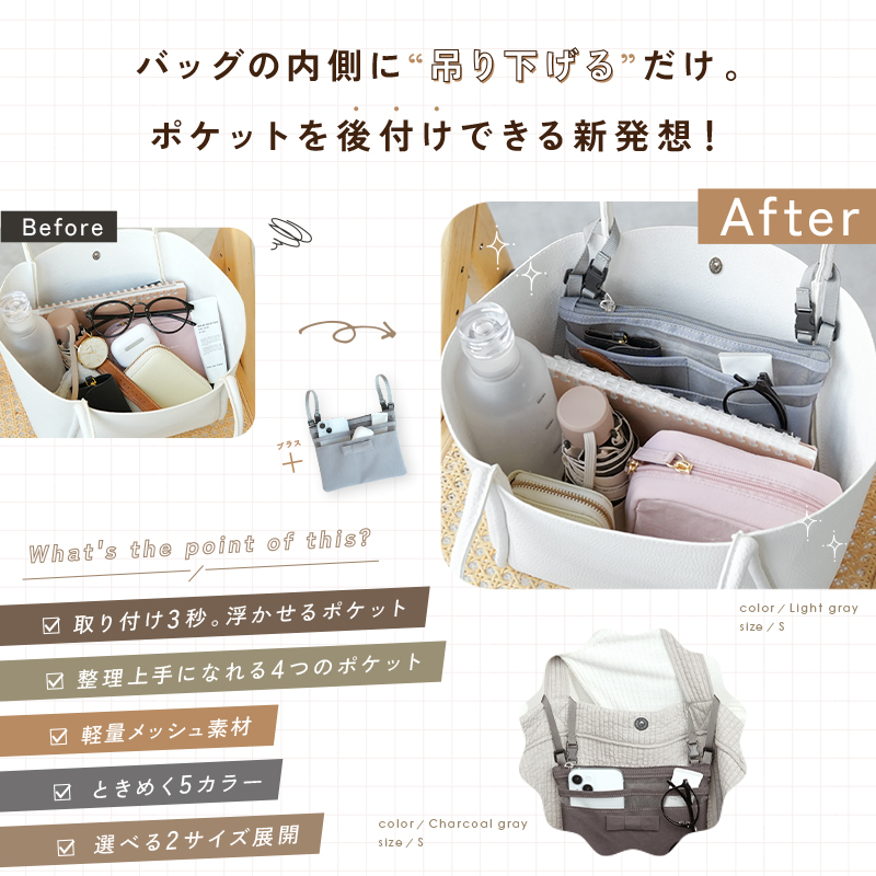 ニュアンスカラー くすみカラー 吊り下げバッグインバッグ バッグインバッグ吊り下げ おしゃれ お洒落 オシャレ 後付けポケット 小物ポケット 大きめ ミニ 収納 軽い ストラップ インナーポーチ ちょい足しポケット トート用 トートバッグ atRise アットライズ 新商品