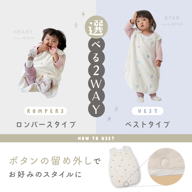 ボタンの付け方を変えるだけで、ロンパース型・ベスト型の2WAYに早変わり!