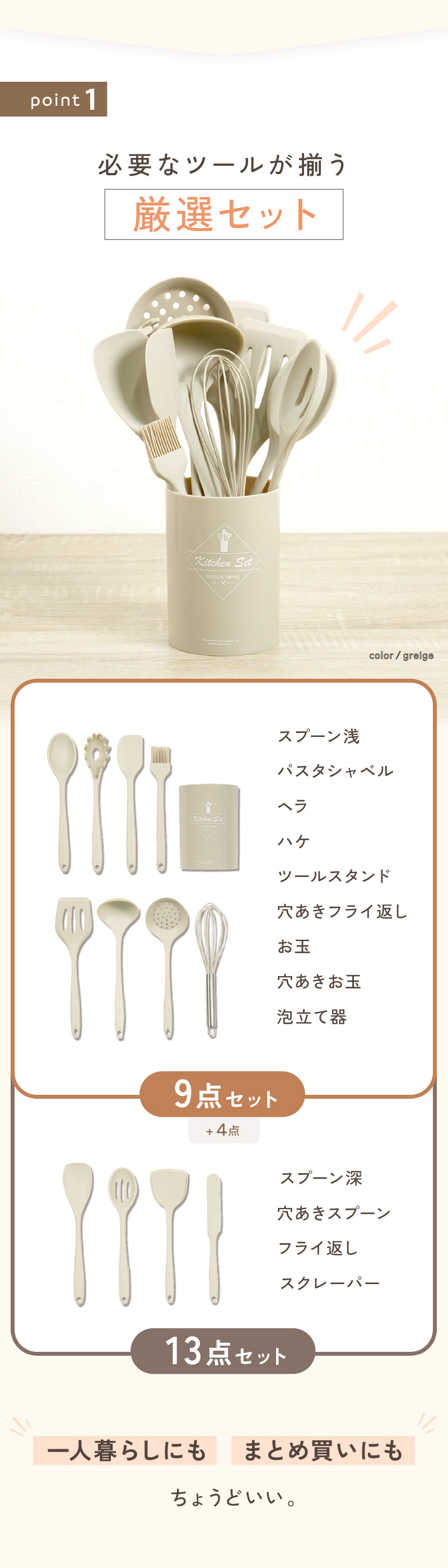 ・13点セット:基本ツールに加え、調理の幅が広がるアイテムをプラスした充実セット