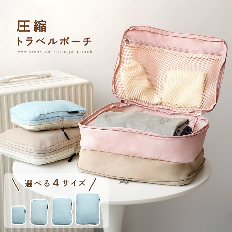 【クーポンで更にお得】トラベルポーチ Lサイズ 4サイズ ニュアンスカラー ポーチ 圧縮バッグ 大容量 おしゃれ 圧縮 旅行 収納 ファスナー 旅行用ポーチ