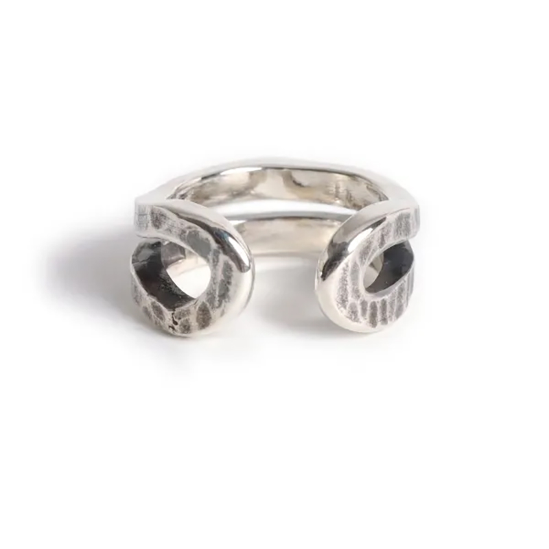 大きな輪を潰して棒状にし、端の輪を対にしたフォルムのデザインです。