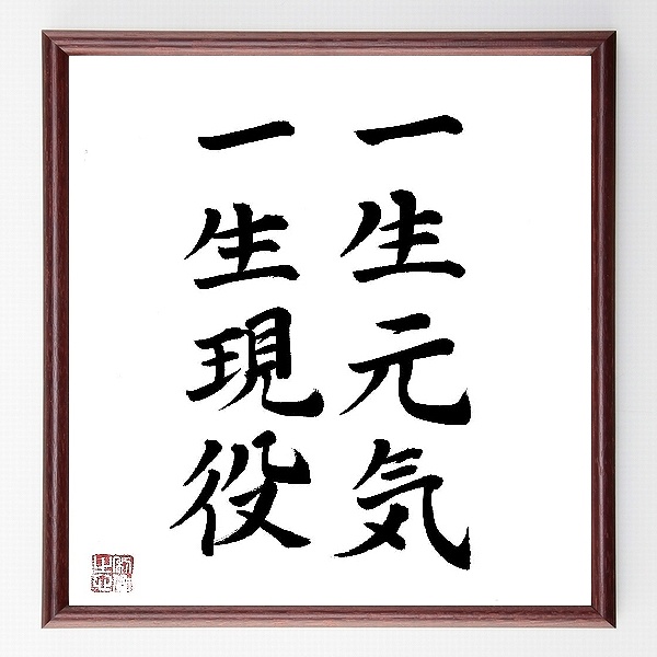 名言「一生元気、一生現役」手書き書道色紙額/毛筆直筆済み