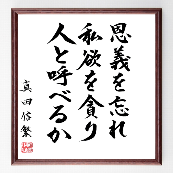 真田信繁(幸村)の名言「恩義を忘れ、私欲を貪り、人と呼べるか」手書き書道色紙額/毛筆直筆済み