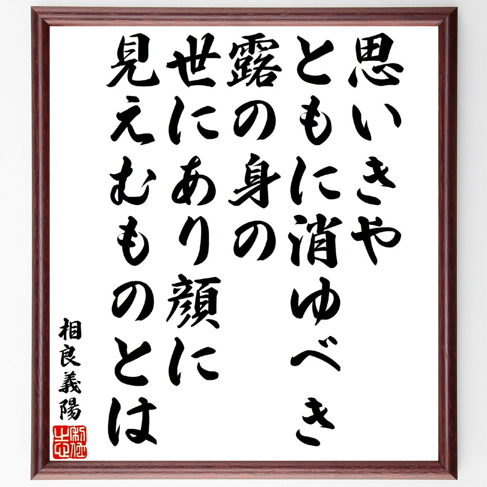 相良義陽の俳句・短歌「思いきやともに消ゆべき露の身の、世にあり顔に見えむものとは」を、千言堂の専属書道家が気持ちを込めて手書き直筆いたします。この言葉(ひとこと)は名言集や本・書籍などで紹介されることも多く、座右の銘にされている方も多いようです。ぜひ、ご自宅の玄関、リビング、部屋、書斎、またビジネスを営む会社のオフィスや店舗の事務所、応接室などにお飾りください。大切な方への贈り物・プレゼントにもおすすめです。一点一点が直筆のため、パソコン制作のような完璧さはございませんが、手書きの良さを感じていただけます。当店では挑戦、努力、成功、幸福、感謝、成長、家族、仕事、自己啓発など様々なテーマから人生の糧となる名言、四字熟語、諺、故事成語、格言を厳選、毛筆で直筆、お届けしています。
