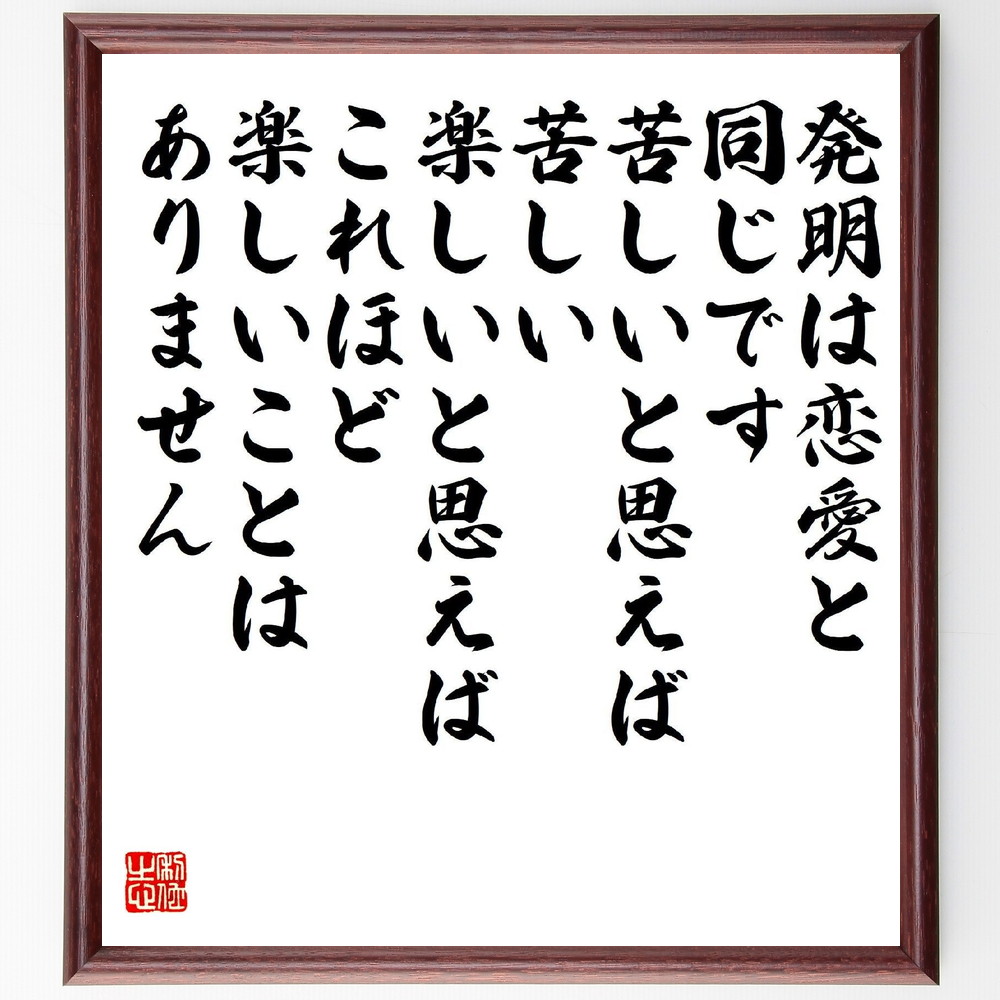 名言「発明は恋愛と同じです、苦しいと思えば苦しい、楽しいと思えばこれほど楽しいことはありません」手書き書道色紙額/受注後の毛筆直筆