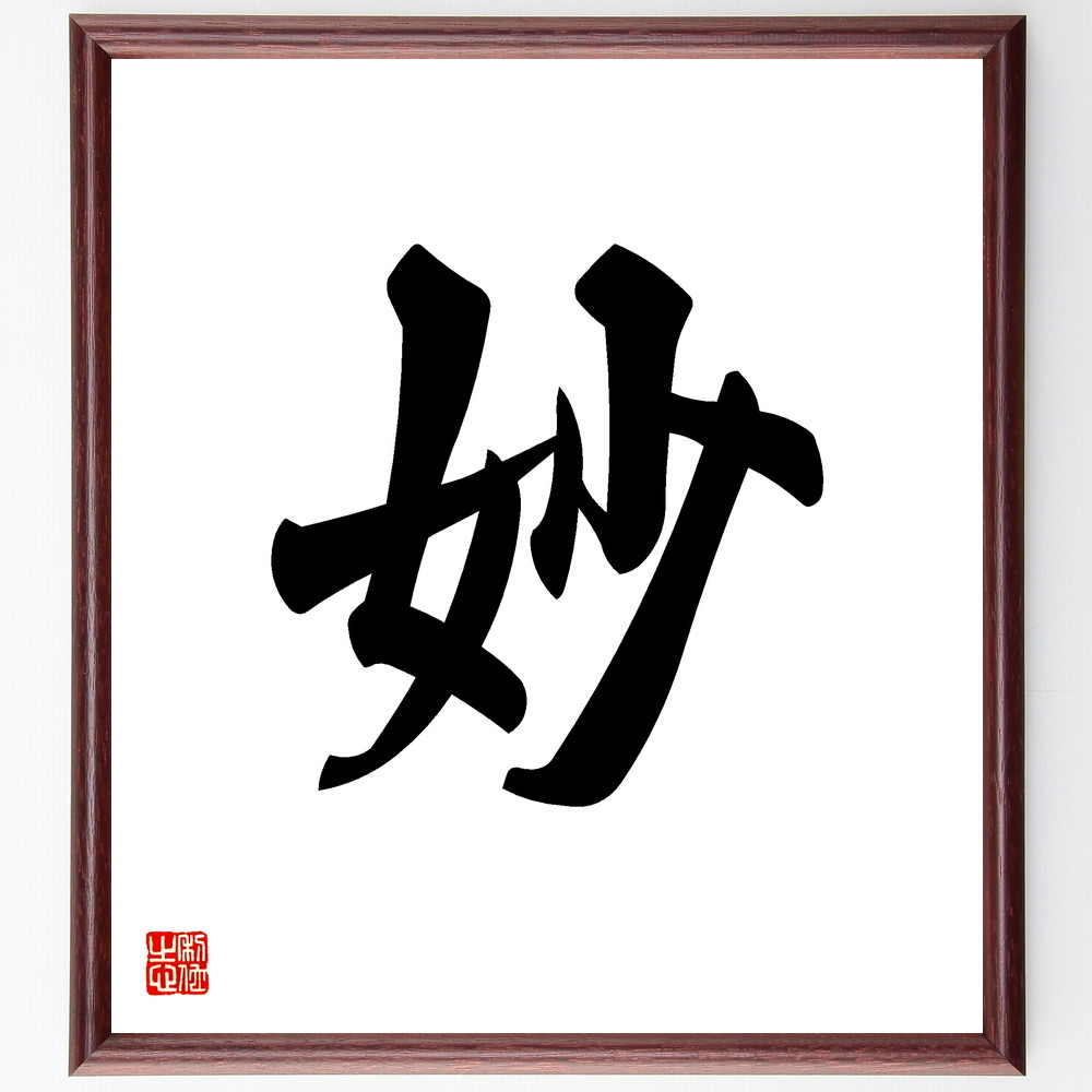 一文字「妙」を、千言堂の専属書道家が気持ちを込めて手書き直筆いたします。この言葉(ひとこと)は名言集や本・書籍などで紹介されることも多く、座右の銘にされている方も多いようです。ぜひ、ご自宅の玄関、リビング、部屋、書斎、またビジネスを営む会社のオフィスや店舗の事務所、応接室などにお飾りください。大切な方への贈り物・プレゼントにもおすすめです。一点一点が直筆のため、パソコン制作のような完璧さはございませんが、手書きの良さを感じていただけます。当店では挑戦、努力、成功、幸福、感謝、成長、家族、仕事、自己啓発など様々なテーマから人生の糧となる名言、四字熟語、諺、故事成語、格言を厳選、毛筆で直筆、お届けしています。