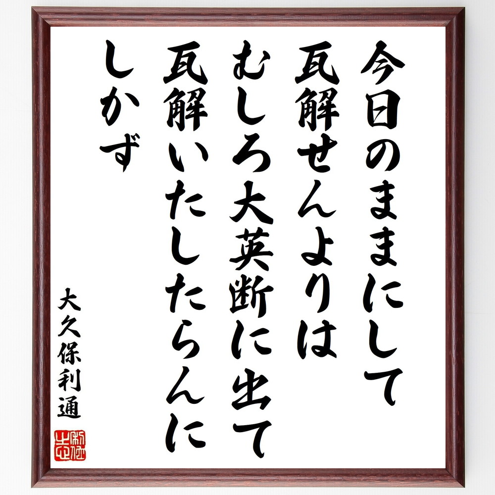 大久保利通の名言「今日のままにして瓦解せんよりは、むしろ大英断に出て、瓦解いたしたらんにしかず」を、千言堂の専属書道家が気持ちを込めて手書き直筆いたします。この言葉(ひとこと)は名言集や本・書籍などで紹介されることも多く、座右の銘にされている方も多いようです。ぜひ、ご自宅の玄関、リビング、部屋、書斎、またビジネスを営む会社のオフィスや店舗の事務所、応接室などにお飾りください。大切な方への贈り物・プレゼントにもおすすめです。一点一点が直筆のため、パソコン制作のような完璧さはございませんが、手書きの良さを感じていただけます。当店では挑戦、努力、成功、幸福、感謝、成長、家族、仕事、自己啓発など様々なテーマから人生の糧となる名言、四字熟語、諺、故事成語、格言を厳選、毛筆で直筆、お届けしています。