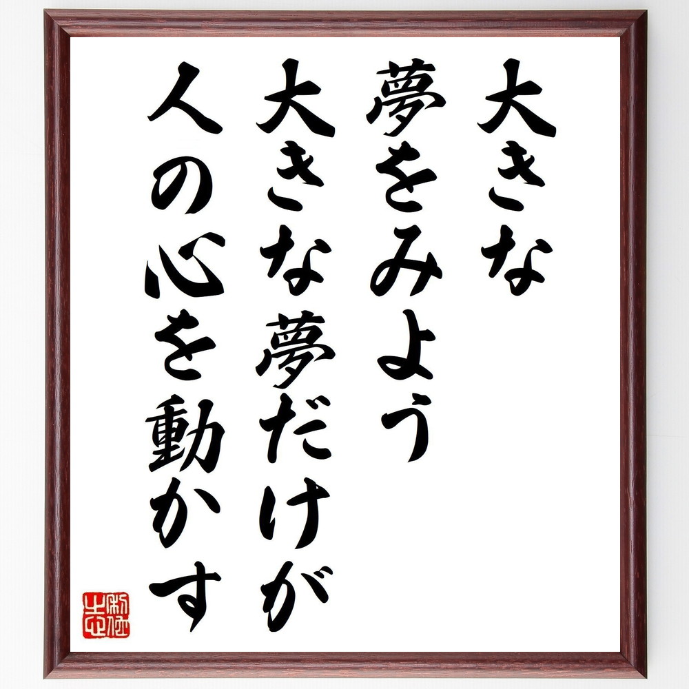 マルクス・アウレリウス・アントニヌスの名言「大きな夢をみよう、大きな夢だけが人の心を動かす」を、千言堂の専属書道家が気持ちを込めて手書き直筆いたします。この言葉(ひとこと)は名言集や本・書籍などで紹介されることも多く、座右の銘にされている方も多いようです。ぜひ、ご自宅の玄関、リビング、部屋、書斎、またビジネスを営む会社のオフィスや店舗の事務所、応接室などにお飾りください。大切な方への贈り物・プレゼントにもおすすめです。一点一点が直筆のため、パソコン制作のような完璧さはございませんが、手書きの良さを感じていただけます。当店では挑戦、努力、成功、幸福、感謝、成長、家族、仕事、自己啓発など様々なテーマから人生の糧となる名言、四字熟語、諺、故事成語、格言を厳選、毛筆で直筆、お届けしています。