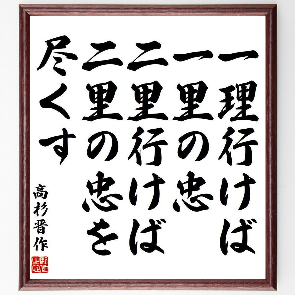 高杉晋作の名言「一理行けば一里の忠、二里行けば二里の忠を尽くす」を、千言堂の専属書道家が気持ちを込めて手書き直筆いたします。この言葉(ひとこと)は名言集や本・書籍などで紹介されることも多く、座右の銘にされている方も多いようです。ぜひ、ご自宅の玄関、リビング、部屋、書斎、またビジネスを営む会社のオフィスや店舗の事務所、応接室などにお飾りください。大切な方への贈り物・プレゼントにもおすすめです。一点一点が直筆のため、パソコン制作のような完璧さはございませんが、手書きの良さを感じていただけます。当店では挑戦、努力、成功、幸福、感謝、成長、家族、仕事、自己啓発など様々なテーマから人生の糧となる名言、四字熟語、諺、故事成語、格言を厳選、毛筆で直筆、お届けしています。