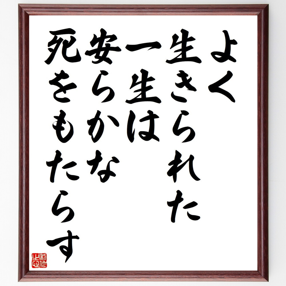 レオナルド・ダ・ヴィンチの名言「よく生きられた一生は、安らかな死をもたらす」を、千言堂の専属書道家が気持ちを込めて手書き直筆いたします。この言葉(ひとこと)は名言集や本・書籍などで紹介されることも多く、座右の銘にされている方も多いようです。ぜひ、ご自宅の玄関、リビング、部屋、書斎、またビジネスを営む会社のオフィスや店舗の事務所、応接室などにお飾りください。大切な方への贈り物・プレゼントにもおすすめです。一点一点が直筆のため、パソコン制作のような完璧さはございませんが、手書きの良さを感じていただけます。当店では挑戦、努力、成功、幸福、感謝、成長、家族、仕事、自己啓発など様々なテーマから人生の糧となる名言、四字熟語、諺、故事成語、格言を厳選、毛筆で直筆、お届けしています。