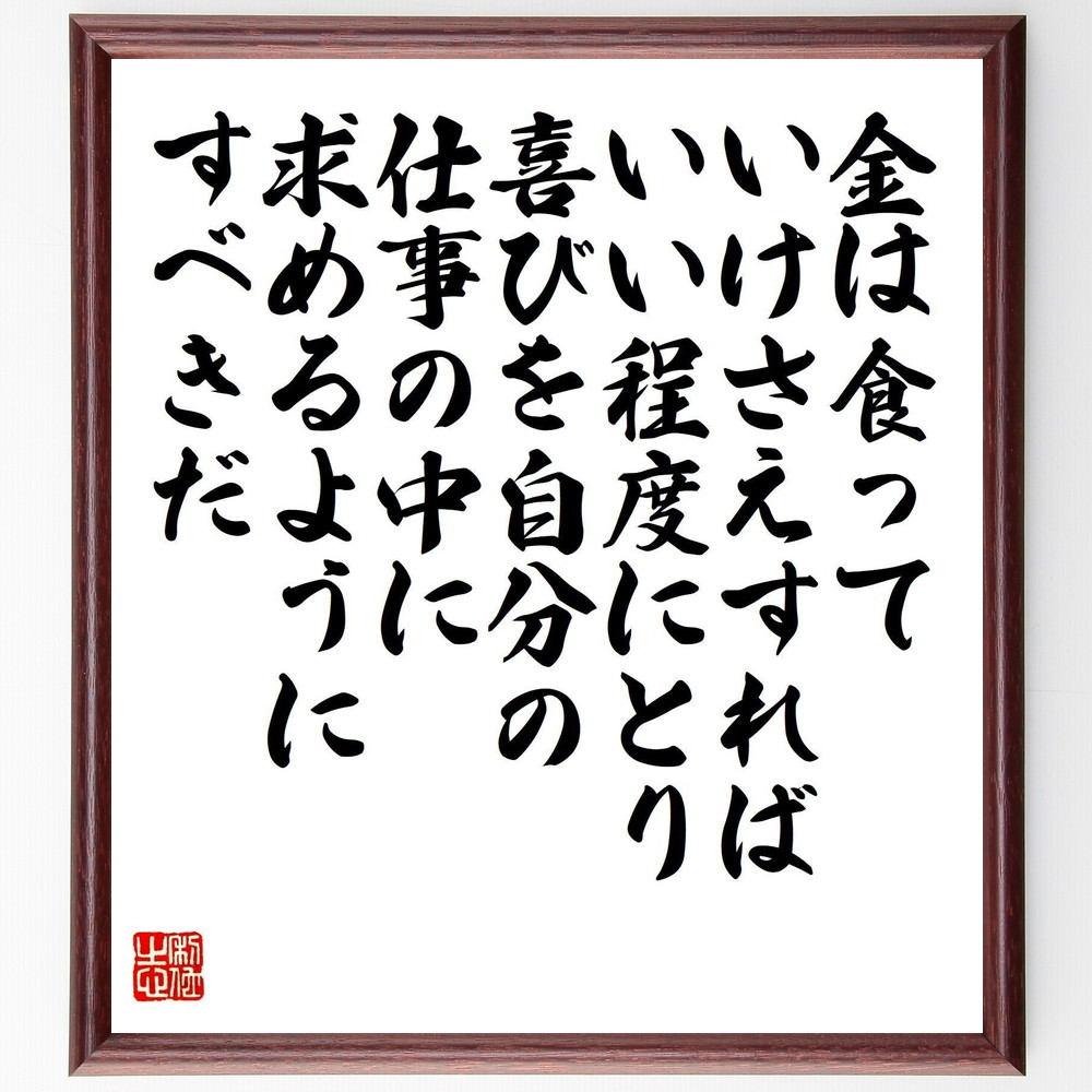 名言「金は食っていけさえすればいい程度にとり、喜びを自分の仕事の中に求めるようにすべきだ」を、千言堂の専属書道家が気持ちを込めて手書き直筆いたします。この言葉(ひとこと)は名言集や本・書籍などで紹介されることも多く、座右の銘にされている方も多いようです。ぜひ、ご自宅の玄関、リビング、部屋、書斎、またビジネスを営む会社のオフィスや店舗の事務所、応接室などにお飾りください。大切な方への贈り物・プレゼントにもおすすめです。一点一点が直筆のため、パソコン制作のような完璧さはございませんが、手書きの良さを感じていただけます。当店では挑戦、努力、成功、幸福、感謝、成長、家族、仕事、自己啓発など様々なテーマから人生の糧となる名言、四字熟語、諺、故事成語、格言を厳選、毛筆で直筆、お届けしています。