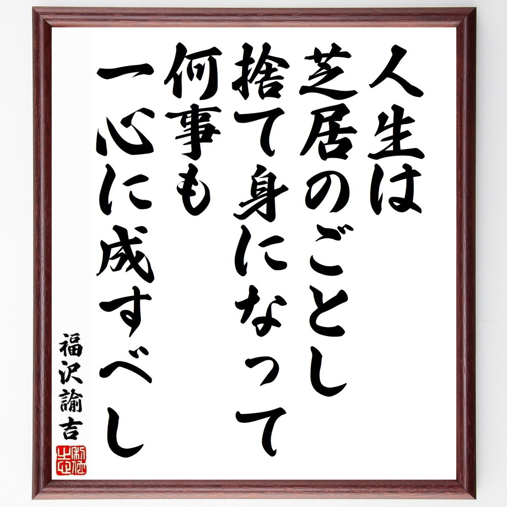福沢諭吉の名言「人生は芝居のごとし、捨て身になって何事も一心に成すべし」手書き書道色紙額/受注後の毛筆直筆