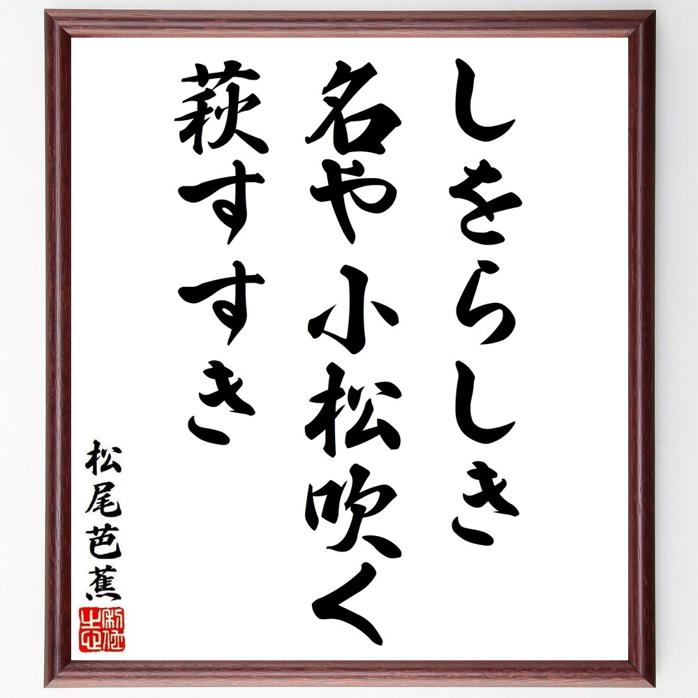 松尾芭蕉の短歌・俳句「しをらしき、名や小松吹く、萩すすき」を、千言堂の専属書道家が気持ちを込めて手書き直筆いたします。この言葉(ひとこと)は名言集や本・書籍などで紹介されることも多く、座右の銘にされている方も多いようです。ぜひ、ご自宅の玄関、リビング、部屋、書斎、またビジネスを営む会社のオフィスや店舗の事務所、応接室などにお飾りください。大切な方への贈り物・プレゼントにもおすすめです。一点一点が直筆のため、パソコン制作のような完璧さはございませんが、手書きの良さを感じていただけます。当店では挑戦、努力、成功、幸福、感謝、成長、家族、仕事、自己啓発など様々なテーマから人生の糧となる名言、四字熟語、諺、故事成語、格言を厳選、毛筆で直筆、お届けしています。